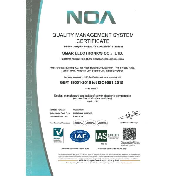 As a subsidiary of KUNSHAN JIAHUA ELECTRONICS CO., LTD., SMAR focuses on the development, production and sales of energy storage connectors and cable modules.In order to further improve the quality management, enhance the corporate efficiency and strengthen the trust of customers, JIACL has independently carried out the certification of the relevant system on the basis of the quality management system inherited from JIAHUA Electronics, aiming to serve the customers in a better way.